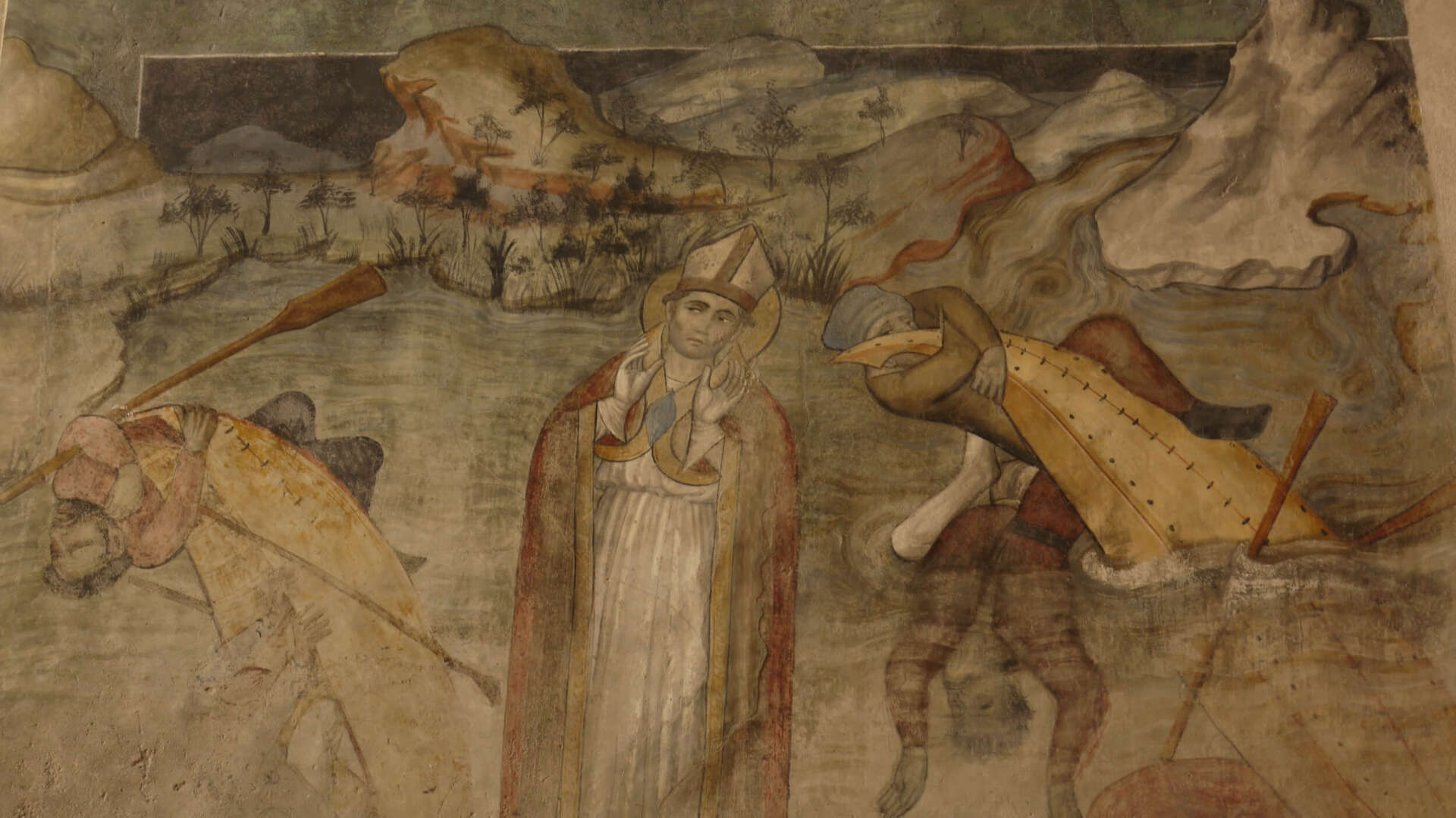 Si continua poi all’interno della chiesa per raggiungere il ciclo di affreschi dedicati a San Biagio dipinti da Giacomo Jaquerio, il maggior rappresentante della pittura tardo gotica in Piemonte di cui quest’anno ricorre il 650esimo anniversario della nascita. Gli affreschi si trovano nella navata destra della chiesa: sulla parete laterale restano tre episodi della vita di San Biagio dei cinque originari. San Biagio è il protettore della gola che chiude il tempo dedicato al Natale: tradizionalmente si celebra il 3 febbraio, il giorno successivo alla Candelora, con la benedizione, attraverso le candele, alla gola dei fedeli per tenere lontano ogni male. Le due scene affrescate in alto, delimitate dagli archi, rappresentano a sinistra il Santo indenne tra gli animali feroci, a destra il miracolo del bambino liberato dalla lisca di pesce che lo stava soffocando; nel registro inferiore l’unica scena rimasta raffigura San Biagio che si salva nel mare in tempesta mentre i cattivi barcaioli annegano. Su una delle due volte della cappella sono rappresentati i simboli dei quattro evangelisti e all’interno di un medaglione è dipinto un ritratto che rappresenterebbe il pittore stesso.