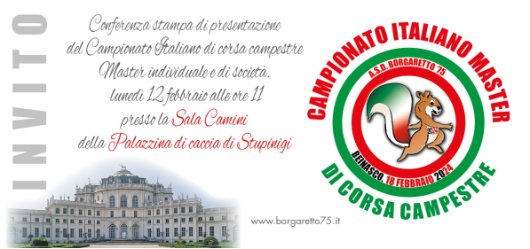 Lunedì 12 febbraio alle ore 11, presso la Sala dei Camini della Palazzina di Caccia di Stupinigi, si terrà la conferenza stampa di presentazione del Campionato Italiano Master di Corsa Campestre Individuale e di Società.