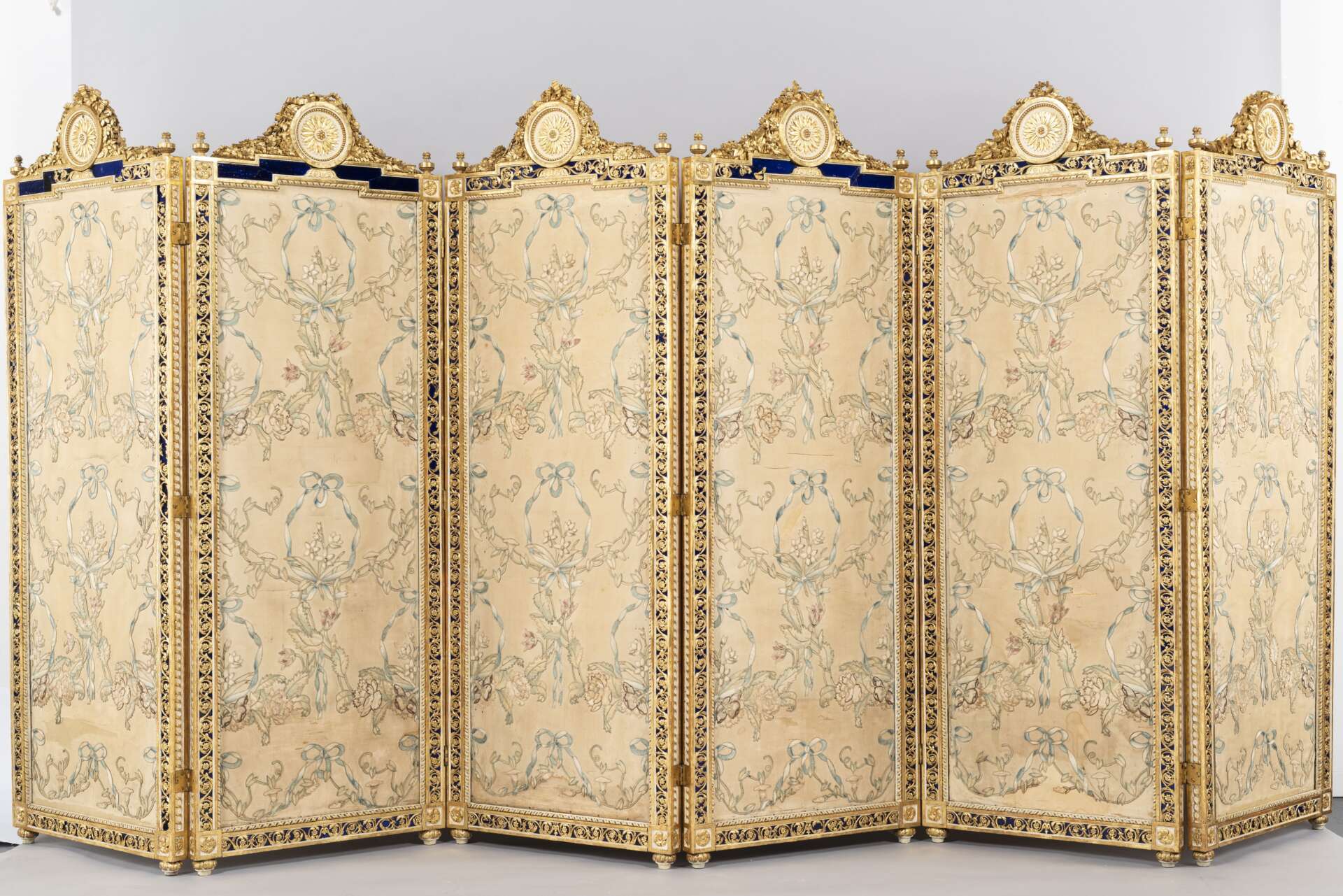 Il secondo progetto interessa il paravento a sei ante dell’Anticamera della Regina, capolavoro tardo-settecentesco attribuito alla bottega di Giuseppe Maria Bonzanigo. Intagli dorati, vetri blu cobalto e pannelli in seta ricamata ne fanno uno degli arredi più scenografici della residenza. La seta, indebolita da luce e umidità, presenta lacerazioni e cedimenti che ne hanno imposto il deposito cautelativo. Il cantiere tessile punterà a consolidare le fibre, integrare le lacune e applicare un velo protettivo per riportare il paravento in sala in piena sicurezza .