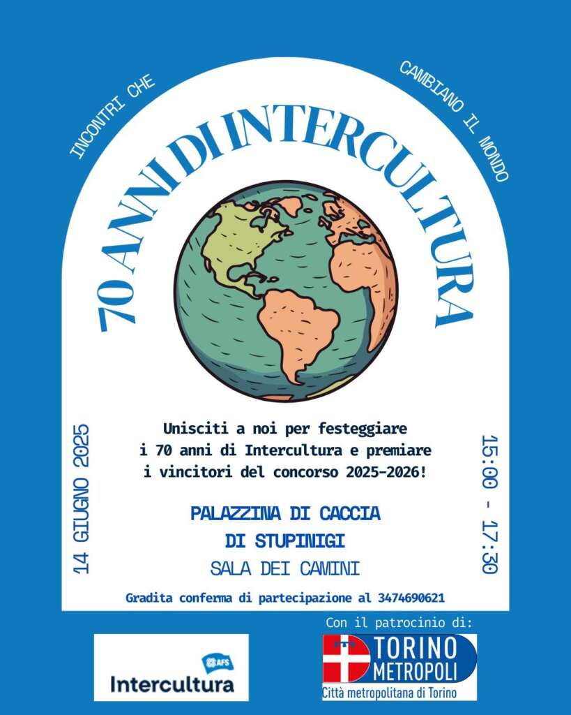 Intercultura è l’associazione nata per promuovere il dialogo tra le culture e gli scambi scolastici internazionali, sviluppando ricerche, programmi e strutture che aiutino le nuove generazioni ad aprirsi al mondo e a vivere da cittadini consapevoli e preparati in una società multiculturale. In occasione dei 70 anni è in programma alla Palazzina di Caccia di Stupinigi (Sala dei Camini), sabato 14 giugno, l’evento “Incontri che cambiano il mondo” con la cerimonia di premiazione dei vincitori del concorso 2025-2026.