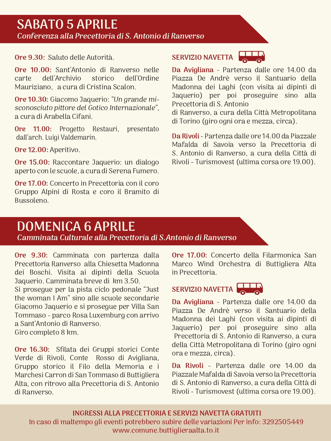 Domenica 6 aprile si terranno le rievocazioni storiche e, alle 9,30, inizierà una camminata culturale ad anello di 3,5 km, con partenza e arrivo alla Precettoria di Sant’Antonio di Ranverso e tappa alla cappella di Madonna dei Boschi per visitare gli affreschi della scuola jaqueriana. Chi è più allenato potrà seguire il percorso di 8 km, che prosegue lungo la pista ciclo pedonale “Just the Woman I Am” sino alle scuole secondarie Giacomo Jaquerio e alla Villa San Tommaso nel parco Rosa Luxemburg, sempre con arrivo a Sant’Antonio di Ranverso. Nel pomeriggio alle 16,30 è in programma la sfilata dei gruppi storici “Conte Verde” di Rivoli, “Conte Rosso” di Avigliana, “Il filo della memoria” e “Marchesi Carron di San Tommaso” di Buttigliera. Alle 17 il programma degli eventi si chiuderà con il concerto della Filarmonica San Marco.